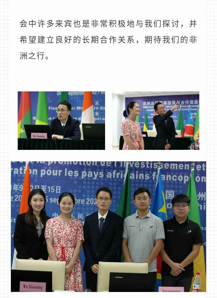2021年9月6日,北京佑平保健食品研发有限公司应福建省对外经济合作中心邀请,由非洲大区市场总监吴小铭作为代表与包括25位来自非洲法语国家经贸、投资促进政府部门官员及企业管理人员就疫情下中国企业如何应对机遇与挑战展开讨论。